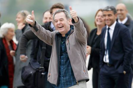 Former French hostage and journalist Didier Francois reacts moments after a transfer by helicopter from Evreux to the military airbase in Villacoublay