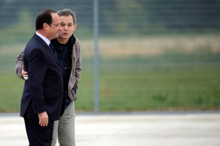 Former hostage, French journalist Francois walks with French President Hollande moments after arriving by helicopter from Evreux to the military airbase in Villacoublay