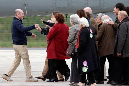 French journalist Nicolas Henin is cheered by relatives as he arrives by helicopter from Evreux to the military airbase in Villacoublay