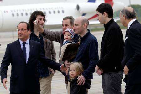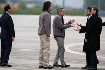 Lagardere, head of French media group Lagardere, greet former hostages, French journalists Francois and Elias as French President Hollande stands near them at military airbase in Villacoublay