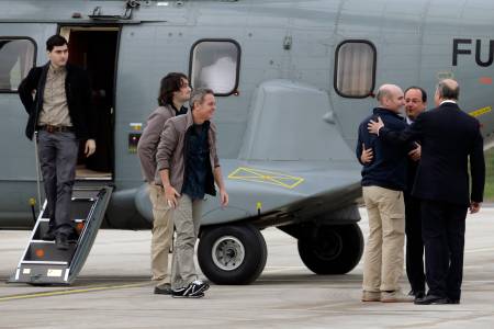 French President Hollande and Foreign Minister Fabius greet former hostages, French journalists Henin, Francois, Elias and Torres upon their arrival by helicopter from Evreux to military airbase in Villacoulbay
