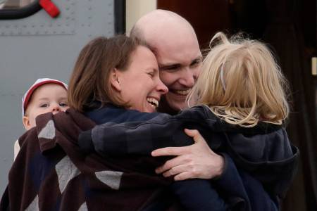 French journalist Nicolas Henin (C), former hostage, is greeted by his family moments after the arrival of the four former hostages by helicopter from Evreux to the military airbase in Villacoulbay, near Paris, April 20, 2014. The four French journalists who were held captive in Syria for more than 10 months arrived back in France on Sunday, a day after being found blindfolded and with hands bound at the Turkish border. REUTERS/Philippe Wojazer (FRANCE - Tags: POLITICS MEDIA CONFLICT TPX IMAGES OF THE DAY) ATTENTION EDITORS: FRENCH LAW REQUIRES THAT THE FACES OF MINORS ARE MASKED IN PUBLICATIONS WITHIN FRANCE