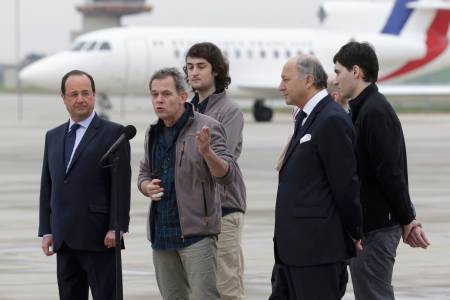 French Presidnt Francois Hollande (C) speaks with former French hostages and journalists, from L-2ndR, Didier Francois, Edouard Elias , Nicolas Henin, who holds his children, Pierre Torres and France's Foreign Minister Laurent Fabius (R), moments after their arrival by helicopter from Evreux to the military airbase in Villacoulbay, near Paris, April 20, 2014. Four French journalists who were held captive in Syria for more than 10 months arrived back in France on Sunday, a day after being found blindfolded and with hands bound at the Turkish border. REUTERS/Gonzalo Fuentes (FRANCE - Tags: POLITICS MEDIA CONFLICT) ATTENTON EDITORS FRENCH LAW REQUIRES THAT THE FACES OF MINORS ARE MASKED IN PUBLICATIONS WITHIN FRANCE