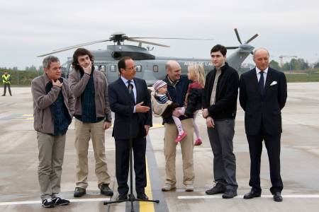 French President Francois Hollande stands with former French hostages and journalists moments after their arrival at Villacoublay