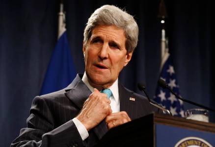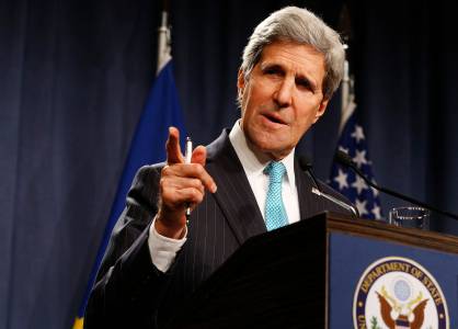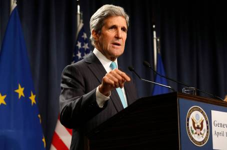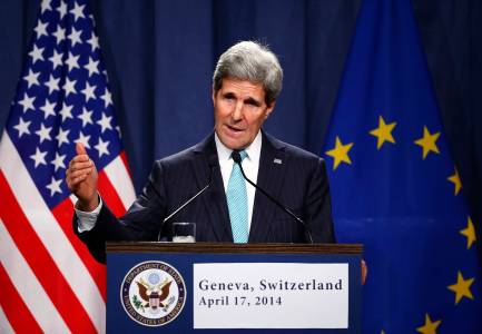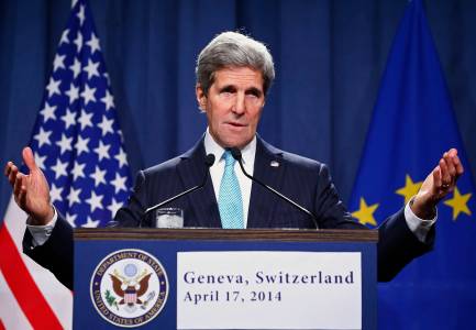 U.S. Secretary of State John Kerry speaks to the media after talks on the situation in Ukraine, in Geneva April 17, 2014. REUTERS/Denis Balibouse (SWITZERLAND - Tags: POLITICS CIVIL UNREST HEADSHOT)