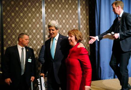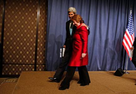 U.S. Secretary of State John Kerry (L) and European Union High Representative Catherine Ashton leave the stage after speaking to the media following a quadrilateral meeting between representatives of the United States, Ukraine, Russia and the European Union, about the ongoing situation in Ukraine, in Geneva April 17, 2014. REUTERS/Jim Bourg (SWITZERLAND - Tags: POLITICS CIVIL UNREST)