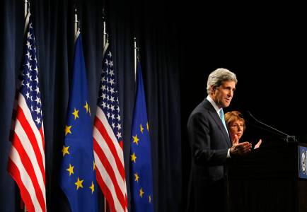 U.S. Secretary of State John Kerry and European Union High Representative Catherine Ashton (R) speak to the media after a quadrilateral meeting between representatives of the United States, Ukraine, Russia and the European Union, about the ongoing situation in Ukraine, in Geneva April 17, 2014. REUTERS/Jim Bourg (SWITZERLAND - Tags: POLITICS CIVIL UNREST)