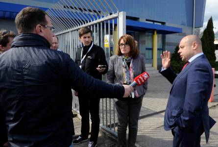 Ukraine's Energy Minister Yuri Prodan (R) answers journalists during a news conference after meeting with Slovak Economy Minister Tomas Malatinsky at a delivery station of pipeline operator Eustream in the eastern Slovak town of Velke Kapusany, near the border with Ukraine, April 15, 2014. The gas border station in Velke Kapusany distributes gas from Russia, going through Ukraine, into western European countries. Slovakia and Ukraine have not yet completed talks allowing the reverse flow of natural gas to Ukraine from the European Union member state but could sign a memorandum in coming days, Slovak Economy Minister Malatinsky said on Tuesday. REUTERS/Radovan Stoklasa (SLOVAKIA - Tags: CIVIL UNREST POLITICS ENERGY BUSINESS)