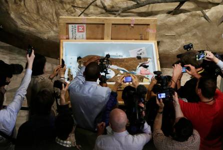 Local media surround a crate containing the jaw bones of a sixty-six million old Tyrannosaurus Rex skeleton at the Smithsonian Museum of Natural History in Washington