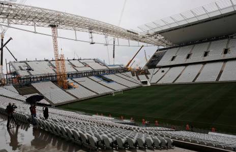 Media personnel record piece-to-camera at construction site of Arena de Sao Paulo Stadium, which will host opening soccer match of 2014 FIFA World Cup, in Sao Paulo