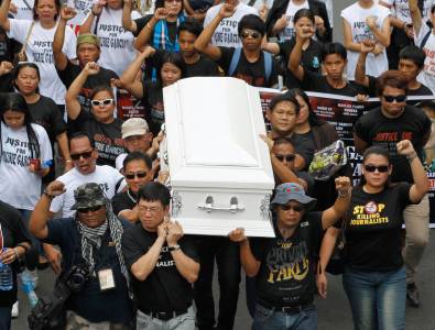 Journalists carry the coffin of slain reporter Rubie Garcia, while marching along a busy street of Manila