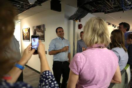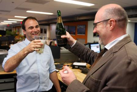 Reuters journalist Szep celebrates with colleagues in the Reuters Washington bureau after winning Pulitzer prize for international reporting
