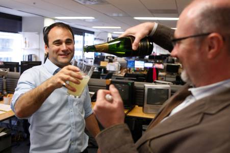 Reuters journalist Jason Szep (C) celebrates with colleagues in the Reuters Washington bureau after it was announced Reuters won a Pulitzer prize for international reporting on the violent persecution of a Muslim minority in Myanmar, April 14, 2014. The Pulitzer Board commended Szep and Andrew Marshall of Reuters for their "courageous reports" on the Rohingya, who in their efforts to flee the country "often fall victim to predatory human-trafficking networks." REUTERS/Stelios Varias (UNITED STATES - Tags: MEDIA)