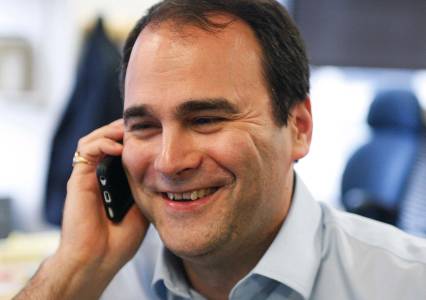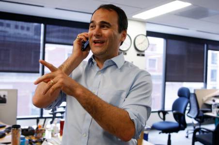 Reuters journalist Jason Szep is congratulated by a colleague on the phone in the Reuters Washington bureau after it was announced Szep and Reuters had won a Pulitzer prize for international reporting on the violent persecution of a Muslim minority in Myanmar, April 14, 2014. The Pulitzer Board commended Szep and Andrew Marshall of Reuters for their "courageous reports" on the Rohingya, who in their efforts to flee the country "often fall victim to predatory human-trafficking networks." REUTERS/Jim Bourg (UNITED STATES - Tags: MEDIA)
