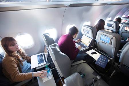 Journalists use their computers to test a new high speed inflight Internet service named Fli-Fi while on a special JetBlue media flight out of John F. Kennedy International Airport in New York