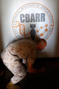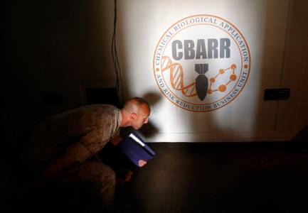 A U.S. marine officer is seen in U.S. MV Cape Ray ship during media tour at naval airbase in Rota