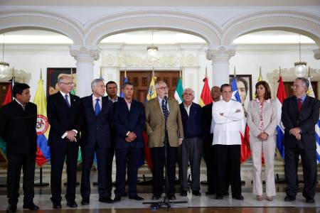 Ramon Guillermo Aveledo (2nd L), secretary of the Venezuelan coalition of opposition parties Mesa de la Unidad (MUD), talks to the media after a meeting in Caracas April 8, 2014. Venezuela's opposition said it agreed to attend exploratory talks on Tuesday with President Nicolas Maduro's government in a bid to end the country's worst political unrest for a decade. Also seen are governor of the state of Lara Henri Falcon (L), Ecuador's Foreign Minister Ricardo Patino (3rd R), Colombia's Foreign Minister Maria Angela Holguin (2nd R) and Brazil's Foreign Minister Luiz Alberto Figueiredo (R). REUTERS/Carlos Garcia Rawlins (VENEZUELA - Tags: POLITICS CIVIL UNREST)
