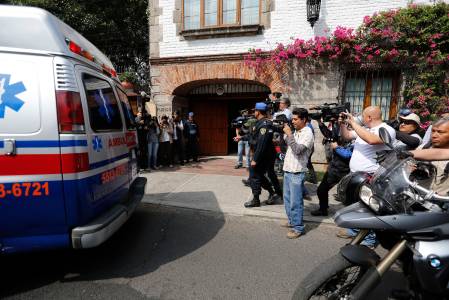 Journalists stand outside the house of Nobel prize-winning Colombian author Garcia Marquez as an ambulance parks reverses into the garage of the author's home in Mexico City