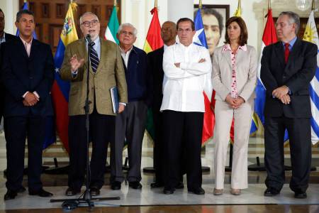 Ramon Guillermo Aveledo (C), secretary of the Venezuelan coalition of opposition parties Mesa de la Unidad (MUD), talks to the media next to the Union of South American Nations' (UNASUR) foreign ministers after their meeting in Caracas April 8, 2014. Venezuela's opposition said it agreed to attend exploratory talks on Tuesday with President Nicolas Maduro's government in a bid to end the country's worst political unrest for a decade. REUTERS/Carlos Garcia Rawlins (VENEZUELA - Tags: POLITICS CIVIL UNREST)
