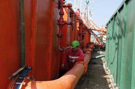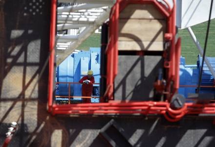 A worker looks on behind the drilling tower at Chevron's site during a media day in Pungesti