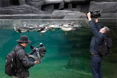 Journalists film Humboldt penguins during press day at the Paris Zoological Park in the Bois de Vincennes in the east of Paris April 8, 2014. Inaugurated in 1934, the Paris Zoo will reopen for the public on April 12, 2014 after being closed for four-years for renovation, transforming the zoo with new quarters for animals and greater information for visitors about the animals and their environment. REUTERS/Charles Platiau (FRANCE - Tags: SOCIETY TRAVEL ANIMALS MEDIA)