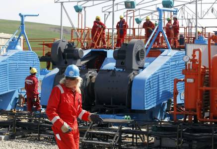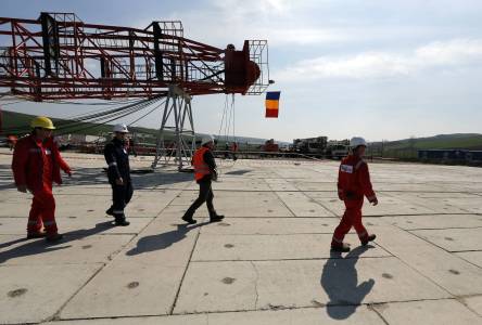 People work at Chevron's drilling site during a media day in Pungesti April 8, 2014. The U.S. Energy Information Administration estimates that Romania and its neighbors Bulgaria and Hungary could between them have 538 billion cubic meters of gas, which would be enough to cover Romania's consumption for almost 40 years. REUTERS/Bogdan Cristel (ROMANIA - Tags: BUSINESS ENERGY ENVIRONMENT)