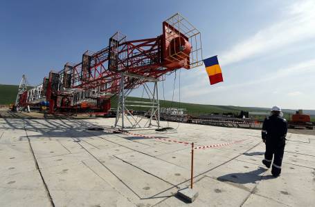 A worker looks on behind the drilling tower at Chevron's site during a media day in Pungesti April 8, 2014. The U.S. Energy Information Administration estimates that Romania and its neighbors Bulgaria and Hungary could between them have 538 billion cubic meters of gas, which would be enough to cover Romania's consumption for almost 40 years. REUTERS/Bogdan Cristel (ROMANIA - Tags: BUSINESS ENERGY ENVIRONMENT)