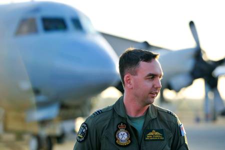 Flight Lieutenant Benn Carroll talks to the media upon AP-3C Orion's return to the RAAF Base Pearce, after a day of searching an area in the Indian Ocean for the missing Malaysia Airlines Flight MH370 April 8, 2014. An Australian ship which picked up possible "pings" from the black box recorders of the missing Malaysia Airlines jetliner has been unable to detect any further signals and time is running out to narrow the massive search, officials said on Tuesday. REUTERS/Richard Polden (AUSTRALIA - Tags: TRANSPORT MILITARY DISASTER)