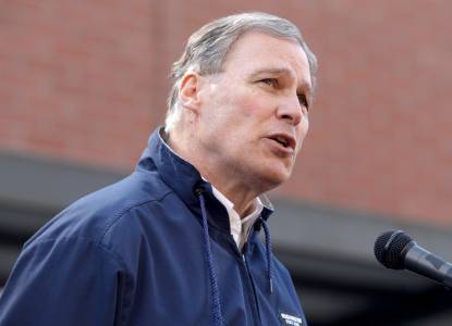 Governor Jay Inslee addresses the media outside the Arlington Police Department in Arlington, Washington