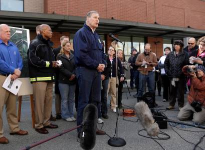 Governor Jay Inslee addresses the media outside the Arlington Police Department in Arlington, Washington as rescuers search for people still missing from a landslide March 23, 2014. Eighteen people remain unaccounted for in a landslide that killed three and injured at least eight more in northwestern Washington state, officials said on Sunday. REUTERS/Jason Redmond (UNITED STATES - Tags: DISASTER ENVIRONMENT)