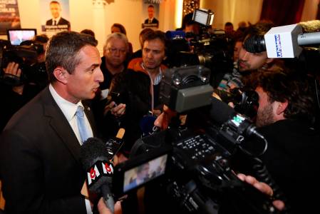 Stephane Ravier, France's far-right National Front political party candidate for the Marseille municipal elections, talks to journalists after the results in the first round of local elections in Marseille March 23, 2014. France's far-right National Front (FN) made gains in a number of towns in the first round of local elections on Sunday, early exit polls showed. REUTERS/Jean-Paul Pelissier (FRANCE - Tags: POLITICS ELECTIONS MEDIA)