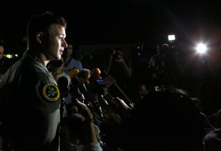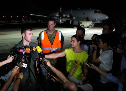 Royal Australian Air Force (RAAF) Flight Lieutenant Russell Adams speaks to members of the media in front of an AP-3C Orion plane at the RAAF Pearce Base in Perth March 23, 2014 after returning from the search for Malaysia Airlines flight MH370. New French satellite images show possible debris from the missing Malaysian airliner deep in the southern Indian Ocean, Malaysia said on Sunday, adding to growing signs that the plane may have gone down in remote seas off Australia. REUTERS/Matt Jelonek/Pool (AUSTRALIA - Tags: MILITARY TRANSPORT MEDIA)