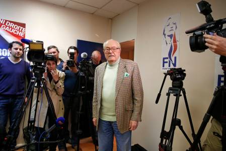 France's far-right National Front political party founder Jean-Marie Le Pen, poses for journalists at the party headquarters after the results in the first round mayoral election in Nanterre, March 23, 2014. France's far-right National Front (FN) made gains in a number of towns in the first round of local elections on Sunday, early exit polls showed REUTERS/Benoit Tessier (FRANCE - Tags: POLITICS ELECTIONS MEDIA)