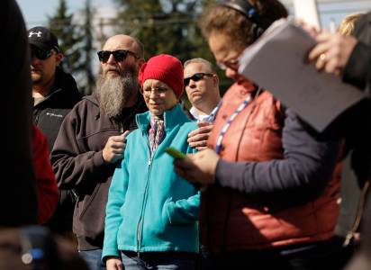 Concerned citizens listen as Washington Governor Jay Inslee addresses the media in Arlington, Washington