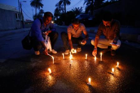Iraqi journalists light candles at the site where Mohammed Badawi, the Baghdad bureau chief of Radio Free Iraq, was shot dead by a Kurdish officer in Baghdad's Jadriyah district March 22, 2014. Badawi was shot dead by the Kurdish officer at a checkpoint in Baghdad on Saturday as he went to work, provoking protests by other journalists and a promise by Prime Minister Nouri al-Maliki to arrest the perpetrator. REUTERS/Thaier al-Sudani (IRAQ - Tags: CIVIL UNREST POLITICS MEDIA)