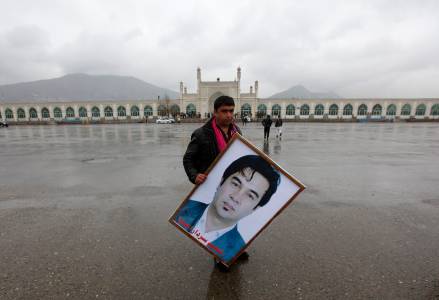 An Afghan man holds a picture of Afghan journalist Sardar Ahmad of Agence France-Presse, during his funeral ceremony in Kabul March 23, 2014. Sardar, his wife and two children were killed during an attack by gunmen at Serena Hotel on Thursday. Taliban gunmen killed nine people, including four foreigners, in the attack on the luxury hotel used by U.N. staff and prominent Afghan politicians in Kabul on Thursday night, before being shot dead by security forces, witnesses and police said on Friday. REUTERS/Mohammad Ismail (AFGHANISTAN - Tags: CIVIL UNREST MEDIA POLITICS)