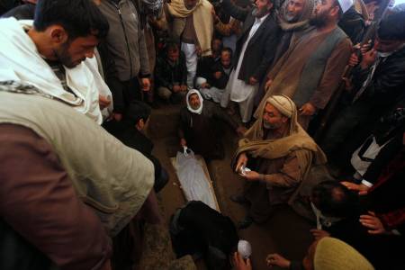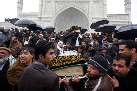 Afghans take part in a burial ceremony of Afghan journalist Sardar Ahmad of Agence France-Presse, in Kabul