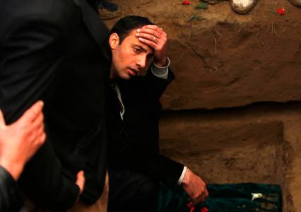 An Afghan man mourns as he sits near the grave of Afghan journalist Sardar Ahmad of Agence France-Presse, during his burial ceremony in Kabul March 23, 2014. Sardar, his wife and two children were killed during an attack by gunmen at Serena Hotel on Thursday. Taliban gunmen killed nine people, including four foreigners, in the attack on the luxury hotel used by U.N. staff and prominent Afghan politicians in Kabul on Thursday night, before being shot dead by security forces, witnesses and police said on Friday. REUTERS/Mohammad Ismail (AFGHANISTAN - Tags: CIVIL UNREST MEDIA POLITICS)