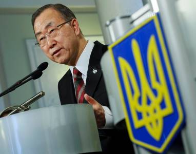 United Nations Secretary General Ban Ki-moon addresses journalists in Kiev