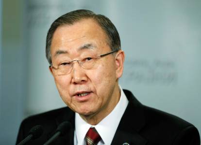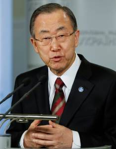 United Nations Secretary General Ban Ki-moon addresses journalists in Kiev March 21, 2014. U.N. Secretary-General Ban Ki-moon urged Ukraine and Russia on Friday to meet for talks to prevent the crisis between them becoming "uncontrollable" and spreading beyond the region. REUTERS/Gleb Garanich (UKRAINE - Tags: POLITICS CIVIL UNREST)