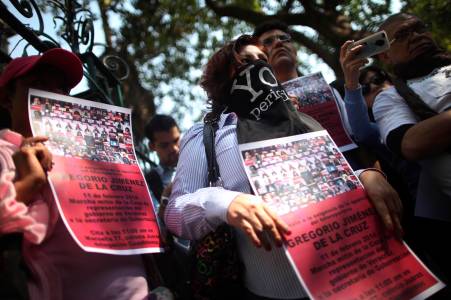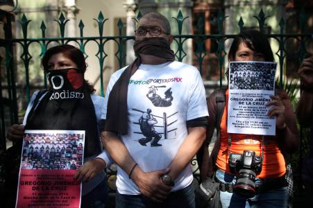 Journalists hold posters as they protest against the kidnapping of Gregorio Jimenez de la Cruz outside the Government of Veracruz building in Mexico City