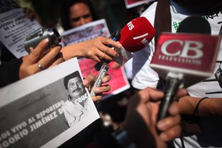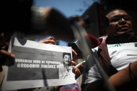 Journalists hold posters as they protest against the kidnapping of Gregorio Jimenez de la Cruz, a reporter for the Veracruz state newspaper Notisur y Liberal del Sur, hours before the discovery of his dead body, outside the Government of Veracruz building in Mexico City February 11, 2014. The body of Jimenez de la Cruz was found in a mass grave next to two other people in Las Choapas village, in the eastern state of Veracruz, after being abducted on February 5, according to local media. REUTERS/Edgard Garrido (MEXICO - Tags: MEDIA CIVIL UNREST CRIME LAW)