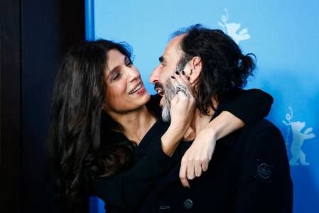 Cast member Mourikis and Greek television journalist Tsapanidou share a moment during a photocall to promote the movie "To Mikro Psari" at the Berlinale International Film Festival in Berlin