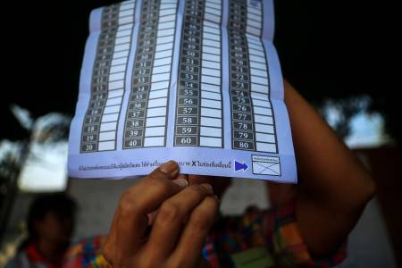 Election commission officials display a ballot paper to the media while counting votes at a polling station in Nonthaburi province