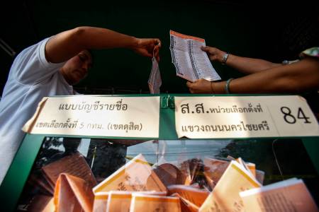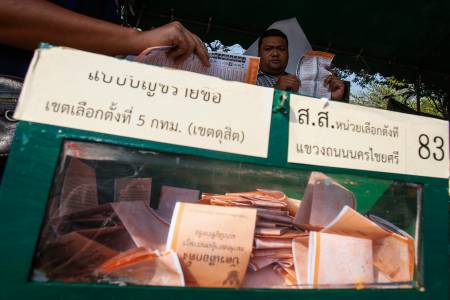 Election commission officials display ballot papers to the media while counting votes at a polling station in Bangkok