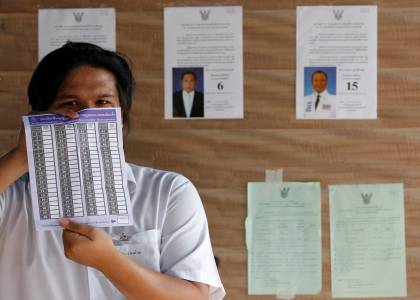 An election commission official displays a ballot paper to the media while counting votes at a polling station in Nonthaburi province