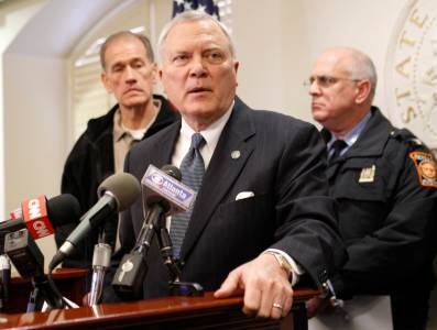 Georgia Governor Nathan Deal (R) speaks to the media as Georgia Emergency Manager Charlie English (L) and Public Safety Director Mark McDonough listen at the State Capitol in Atlanta, Georgia, January 30, 2014. Deal stated he took full responsibility for thousands of motorists and school children being stranded after an ice storm paralyzed much of the region, blocking highways and leading to at least seven deaths. REUTERS/Tami Chappell (UNITED STATES - Tags: ENVIRONMENT POLITICS DISASTER)