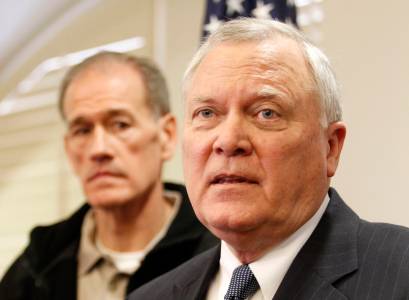 Georgia Governor Nathan Deal (R) speaks to the media as Georgia Emergency Manager Charlie English listens at the State Capitol in Atlanta, Georgia, January 30, 2014. Deal stated he took full responsibility for thousands of motorists and school children being stranded after an ice storm paralyzed much of the region, blocking highways and leading to at least seven deaths. REUTERS/Tami Chappell (UNITED STATES - Tags: ENVIRONMENT DISASTER POLITICS)