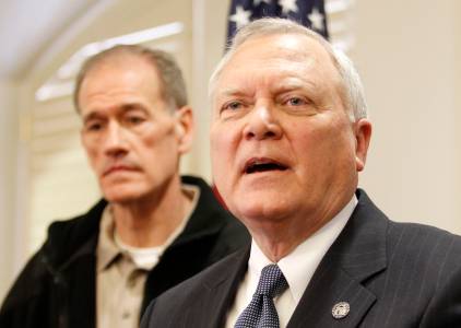 Georgia Governor Nathan Deal (R) speaks to the media as Georgia Emergency Manager Charlie English listens at the State Capitol in Atlanta, Georgia, January 30, 2014. Deal stated he took full responsibility for thousands of motorists and school children being stranded after an ice storm paralyzed much of the region, blocking highways and leading to at least seven deaths. REUTERS/Tami Chappell (UNITED STATES - Tags: ENVIRONMENT POLITICS DISASTER)