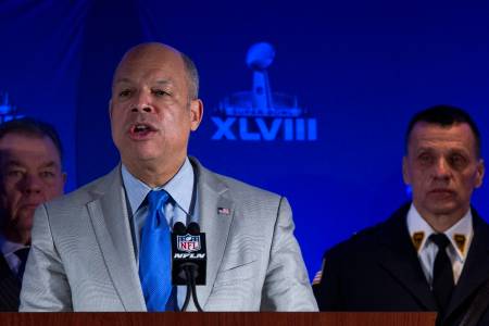 U.S. Secretary of Homeland Security Jeh Johnson speaks with the media during the NFL's security press conference ahead of Super Bowl XLVIII in New York